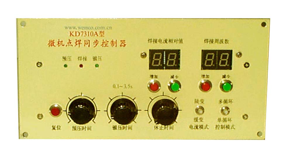 KD7310型 數(shù)顯式點(diǎn)焊同步控制器 簡 介 KD7310系列微機(jī)點(diǎn)焊同步控制器,是一種由單片機(jī)作為主控制單元的點(diǎn)焊同步控制器。 該控制器能對點(diǎn)焊機(jī)的預(yù)壓——焊接——-鍛壓——休止這四個程序段的工作時間(周波數(shù))及焊接電流進(jìn)行調(diào)節(jié)和同步控制,實(shí)現(xiàn)焊接電流的緩變/陡變轉(zhuǎn)換,腳踏開關(guān)單循環(huán)/多循環(huán)的選擇和電網(wǎng)電壓的補(bǔ)償。并對焊接程序段的參數(shù)實(shí)現(xiàn)數(shù)字式調(diào)節(jié)和顯示。 由于采用了單片機(jī)作為主控單元,本控制器的體積和重量與傳統(tǒng)電路組成的控制器相比,不僅體積和重量大為減少,更重要的是大大提高了產(chǎn)品的可靠性和穩(wěn)定性,使產(chǎn)品的性能/價(jià)格比大幅度提高。其小巧的的體積也便于將其嵌入焊機(jī)內(nèi)部,縮小了整機(jī)體積,降低了制造成本。 由于采用了低功耗的單片機(jī)芯片WE7310,使得本控制器整機(jī)功耗只有15W。實(shí)屬節(jié)能產(chǎn)品。 本控制器的高度集成化,尤其是I2C總線的應(yīng)用,使得電路十分簡潔。這不僅便于產(chǎn)品的調(diào)整、維護(hù)和保養(yǎng),同時也便于用戶在技術(shù)改造過程中自行仿制。只要不以我公司的名稱、商標(biāo)和型號進(jìn)行銷售,我公司歡迎用戶推廣、使用和仿制本產(chǎn)品,必要時我們甚至可以進(jìn)行技術(shù)指導(dǎo)。 KD7310系列微機(jī)點(diǎn)焊同步控制器共有三個品種,它們是:主要供焊機(jī)生產(chǎn)廠家整機(jī)配套使用的嵌入式KD7310A,如圖一所示。主要供焊機(jī)用戶對老產(chǎn)品進(jìn)行技術(shù)改造用的外掛式KD7310B,如圖二所示。以及將控制單元和主晶閘管合成一體,獨(dú)立于焊機(jī)以外的分體式KD7310C。對于嵌入式和外掛式控制器而言,僅包括控制單元,主晶閘管作為單獨(dú)組件供應(yīng)。 主要技術(shù)指標(biāo)如下: 1、 程序段數(shù)量: 4(預(yù)壓、焊接、鍛壓、休止) 2、 預(yù)壓時間: 0.1~3.5s 3、 鍛壓時間: 0.1~3.5s 4、 休止時間: 0.1~3.5s 5、 焊接周波數(shù): 0~99 (0~1.98s)6、 周波數(shù)精度: ±1 7、 焊接電流調(diào)節(jié)范圍:0~99.5 (相對值) 8、 電流變化模式: 緩變/陡變 9、 腳踏開關(guān)模式: 單循環(huán)/多循環(huán) 9、 控制輸出量: 主晶閘管觸發(fā)信號和電磁閥開關(guān)量 10、最大控制電流: 300A (對分體式KD7310C而言) 11、電源電壓: AC 380V 50Hz 12、功耗: ≤15W (不含KD7310C)